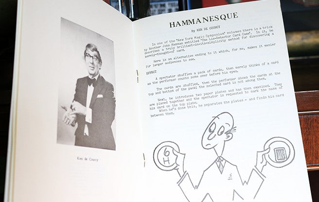 Hammanesque is a fantastic effect based on an effect from Brother John Hamman. A card is thought of by the spectator, and the spectator writes down the selection on a piece of cardboard, paper plate, etc. He then places that piece onto another. When the cardboard or plate is lifted, the spectator finds his or her card sitting on top of the plate or board. A very unique and clever effect and method.